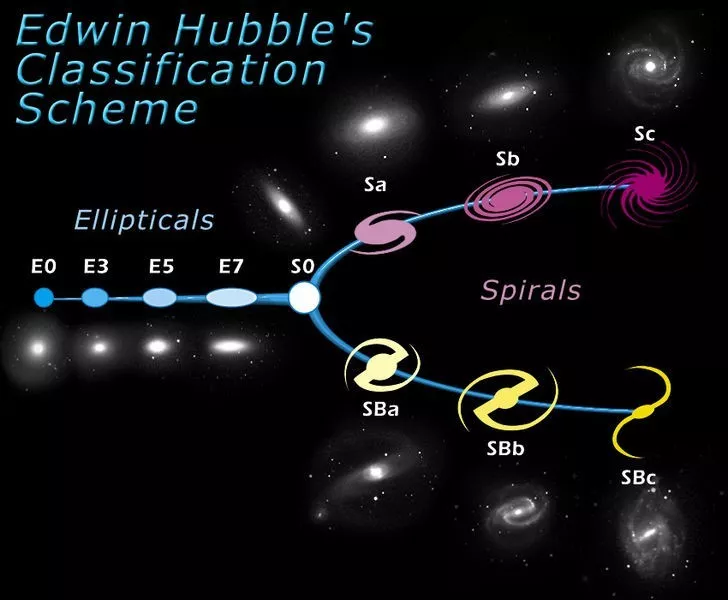 哈勃在發現和認證了河外星係之後,進一步對河外星係的形態做了係統研究。哈勃發現看上去形態各異的星係可以分為(wei) 三大類,橢圓星係、旋渦星係、不規則星係,此外還存在一種過渡類型--透鏡星係。這種分類方法可以用哈勃音叉圖來概括。