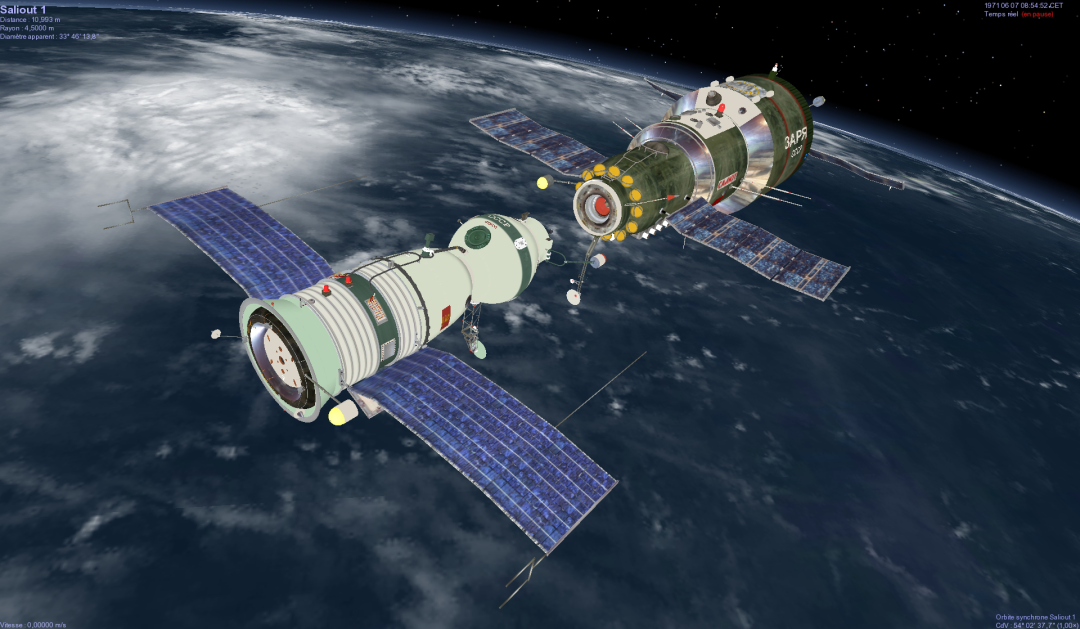 在對接的同時,聯盟十一號飛船的電氣係統和液壓係統也同禮炮一號試驗性空間站連接。經過壓力調節並打開艙門後,航天員進入了禮炮一號試驗性空間站。