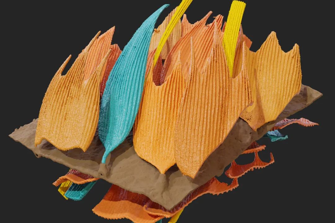 蛾子翅膀的局部3D圖像(基鱗用橙色標出,蓋鱗用藍色標出)| Simon Reichel, Thomas Neil, Zhiyuan Shen & Marc Holderied