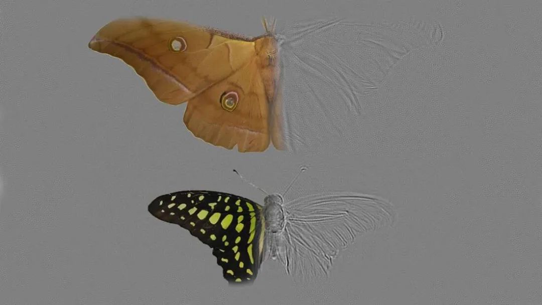 回聲圖像中,可以隱身的中華柞蠶蛾(上)和沒法隱身的統帥青鳳蝶(Graphium agamemnon)(下) | Marc Holderied, Thomas Neil