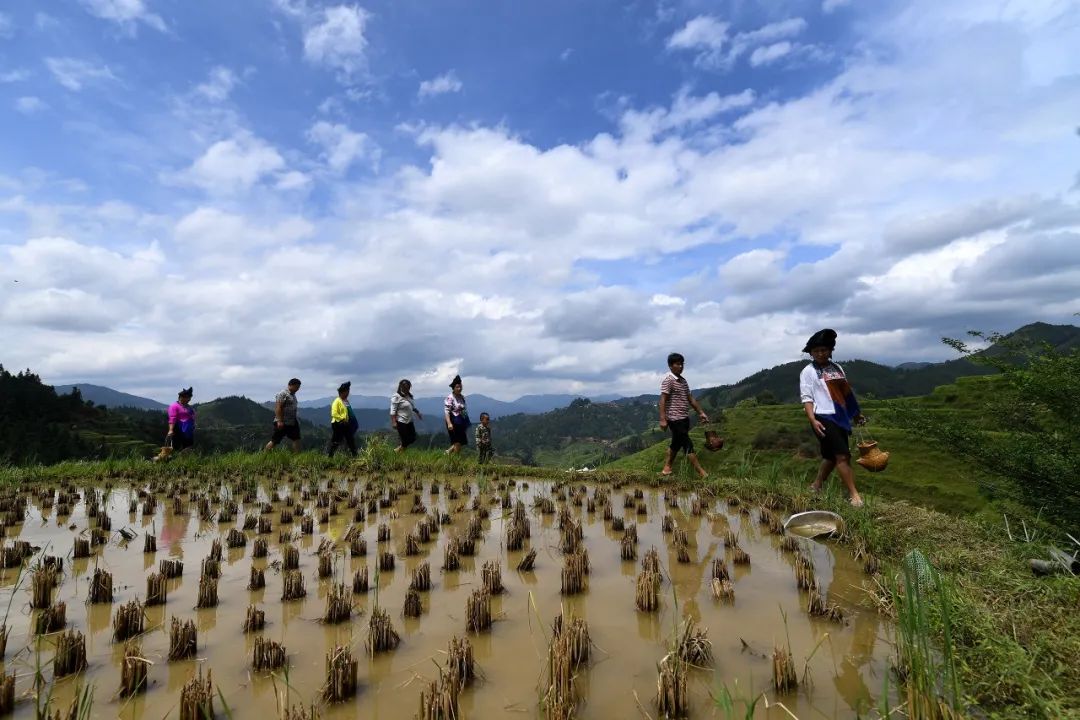 2018年9月18日,在廣西柳州市融水苗族自治縣拱洞鄉(xiang) 瑤龍村高亮屯,村民們(men) 提著裝滿螺螄的小籮筐走在田埂上。(黎寒池攝)