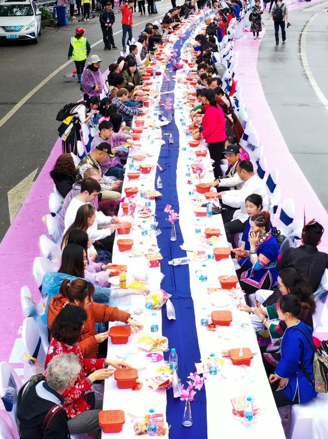 在廣西柳州市體(ti) 育中心,人們(men) 在螺螄粉長桌宴上品嚐螺螄粉。(黎寒池 攝)