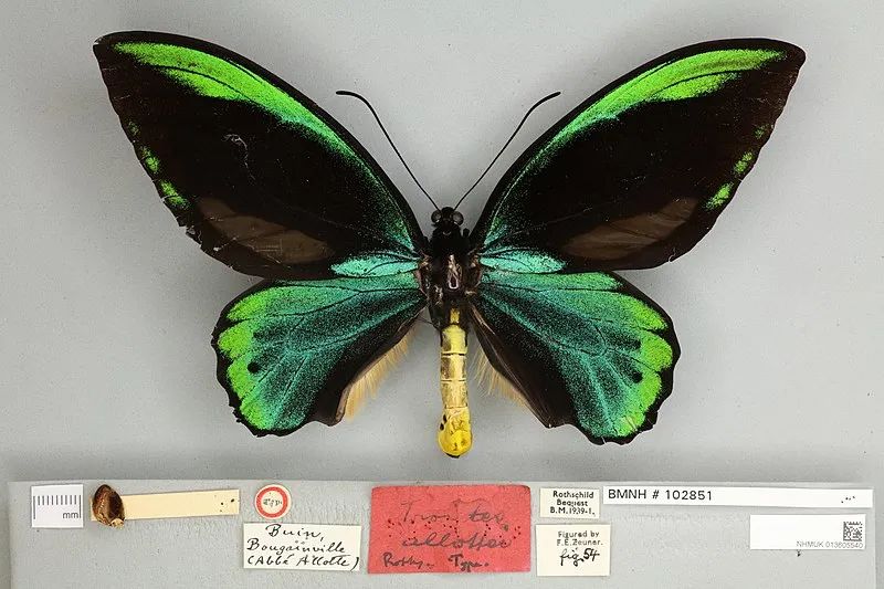 倫(lun) 敦自然博物館的阿勞泰鳥翼鳳蝶Ornithoptera allotei,有人認為(wei) 它不是一個(ge) 物種,而是雜交的後代 | Peter Wing / Wikimedia Commons