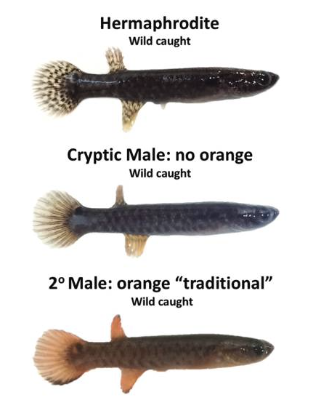 雌雄同體(ti) 的紅樹林鱂(上)和兩(liang) 種雄性,中是隱性雄性表型,下是常見雄性表型。圖片來源:(DOI)10.1086/700697
