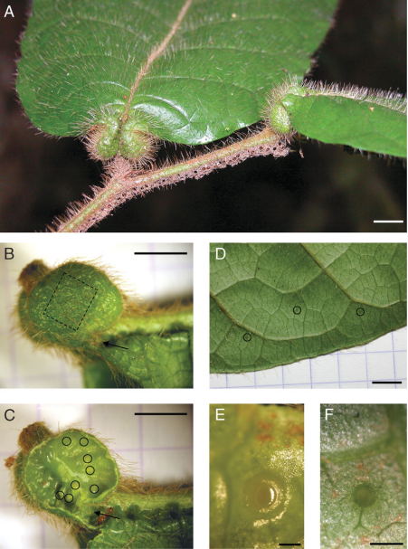 貓須李上形成的蟲穴(A、B、C)以及葉上的蜜腺(D、E、F)