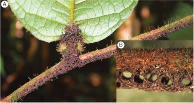 這樣看起來好像是聰明且勤勞的螞蟻大獲全勝。貓須李慘遭拔毛。要知道,這些毛被就如同我們(men) 的體(ti) 毛一樣,可以幫助植物調節體(ti) 溫與(yu) 防禦敵害,說沒就沒了,還是蠻慘的。可事情並沒有這麽(me) 簡單,這場戰役中我們(men) 忘了還有另一個(ge) 參與(yu) 者-真菌。