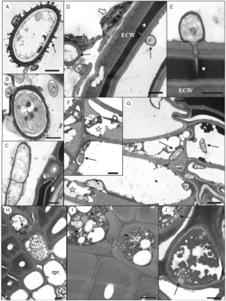 滲透進植物莖中的菌絲(si) ,白色的星形為(wei) 菌絲(si)