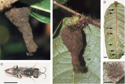 這場自然演化形成的穩固關(guan) 係也有了新角色的加入。研究者發現,在貓須李葉柄處形成的蟲穴旁,有種胡蜂會(hui) 在下麵築巢,而且築巢的材料也頗為(wei) 奇特。胡蜂會(hui) 在貓須李的葉上采集真菌的菌絲(si) 為(wei) 主要的原料,再加上蜘蛛絲(si) 來縫合,製作自己的巢穴。