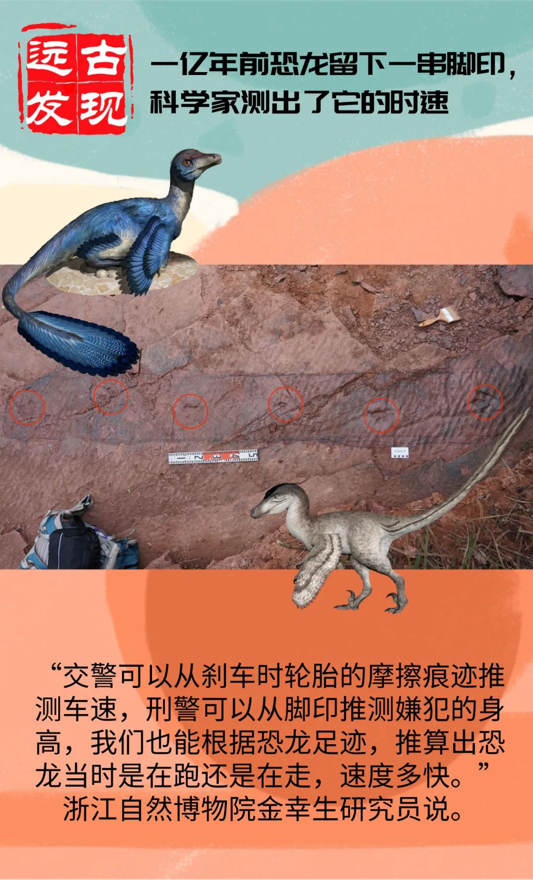 “交警可以從(cong) 刹車時輪胎的摩擦痕跡推測車速,刑警可以從(cong) 腳印推測嫌犯的身高,我們(men) 也能根據恐龍足跡,推算出恐龍當時是在跑還是在走,速度多快。”金幸生研究員說。