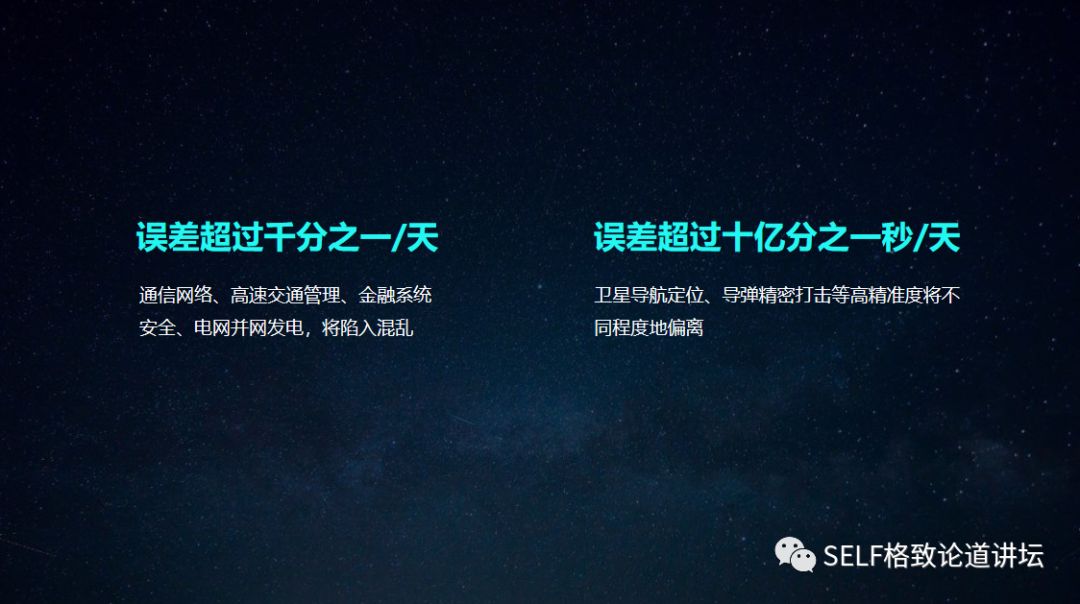 我給大家兩(liang) 個(ge) 數字:如果一天的計時誤差超過千分之一秒,那麽(me) 通信網絡、交通、金融係統、安全、電網發電等,就會(hui) 陷入混亂(luan) ;如果一天的計時誤差超過十億(yi) 分之一秒,那麽(me) 咱們(men) 的導航定位係統就不能像現在有這麽(me) 高的精度了。