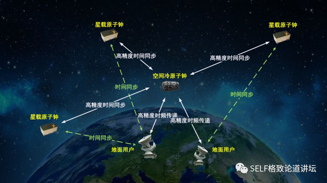 用冷原子可以大幅度提高原子鍾的精度。但怎麽(me) 樣用這個(ge) 原子鍾呢?大家看這張圖,這是星間鏈路圖。