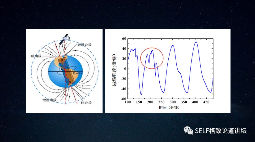 從(cong) 圖中我們(men) 可以看到,它每隔90分鍾繞地球一周,軌道高度400千米。它一直在切割磁力線,右圖就是它所感受到的磁場強度圖。這個(ge) 地磁場已經被我們(men) 削弱了一萬(wan) 倍。我們(men) 可以看到圖中有一個(ge) 紅色的圈。