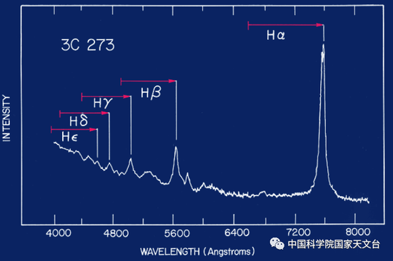 1963年,旅美荷蘭(lan) 天文學家Maarten Schmidt對3C 273進行了光譜觀測,發現其具有寬發射線和吸收線,其中的發射線其實就是位置向紅端移動的氫原子的巴爾末線係,通過與(yu) 靜止係中的巴爾末線係比較,他最終定出了發射線的紅移。因此3C 273是第一顆被光譜證認的類星體(ti) ,Maarten Schmidt也由此被稱為(wei) 發現類星體(ti) 的第一人,從(cong) 此拉開了發現類星體(ti) 的序幕。