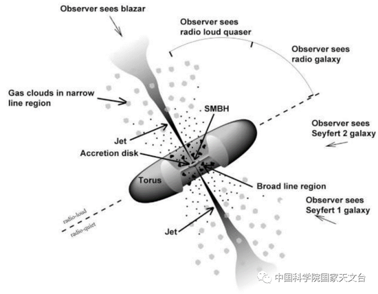 按照活動星係核統一模型(見圖3),類星體(ti) 是活動星係核的一種,中心被質量為(wei) 太陽質量數百萬(wan) 到數十億(yi) 倍的超大質量黑洞主導,黑洞被一個(ge) 氣體(ti) 吸積盤包圍。當中心黑洞從(cong) 吸積盤中吸積物質時,能量以電磁輻射的形式釋放出來,電磁輻射覆蓋整個(ge) 電磁波段。類星體(ti) 輻射的能量是巨大的;最亮的類星體(ti) 的光度是像銀河係樣的星係的數千倍。類星體(ti) 的紅移很大,紅移反映了退行,因此類星體(ti) 的紅移是宇宙起源的。
