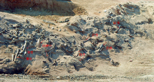 諸城各化石點埋藏的恐龍化石90%都屬於(yu) 鴨嘴龍,化石基本為(wei) 無關(guan) 聯(散了架)的大小不一的骨骼,包括股骨、肱骨、肋骨、脛骨和肩胛骨等,其中以肋骨為(wei) 主,其次是股骨、脛骨及趾骨等,還有一些圓形骨骼“礫石”飄浮狀產(chan) 出,也有無數的細小骨骼化石殘片,另外還有零星其它脊椎類動物化石(龜鱉類)。極少數半關(guan) 聯小個(ge) 體(ti) 恐龍,但都分選差,排列混亂(luan) 。