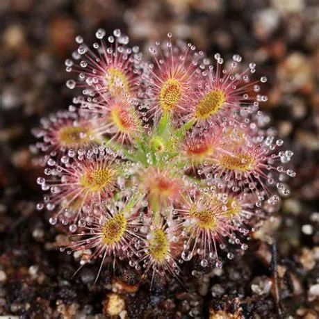 粘蠅板:茅膏菜科植物一般都比較嬌小,有鮮豔的紅色或紫色葉片,葉片上密布著細細的腺毛,腺毛頂端分布有花蜜般晶瑩剔透的粘液,事實上這些粘液卻是茅膏菜為(wei) 昆蟲編織的“甜蜜陷阱”,每一片葉子都是它精心設計的“粘蠅板”。昆蟲一旦被吸引就會(hui) 被粘住而無法動彈,粘液還會(hui) 堵塞昆蟲的呼吸通道,讓其窒息而亡。在捕獲昆蟲後,有些種類的茅膏菜還會(hui) 將腺毛慢慢彎曲收攏,將昆蟲緊緊包裹,以增加粘液的接觸麵積,這樣能更高效地吸收昆蟲身體(ti) 中的營養(yang) 。