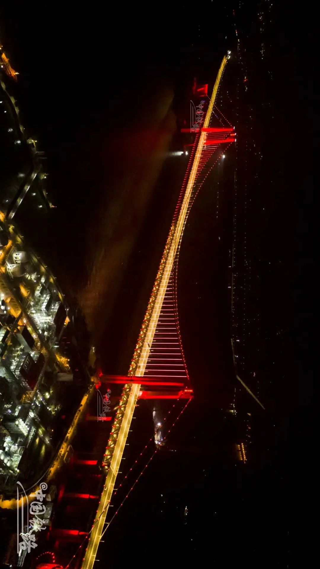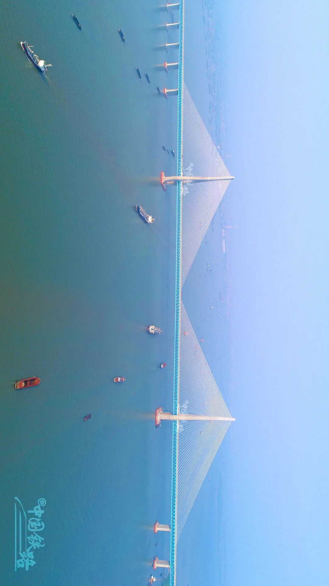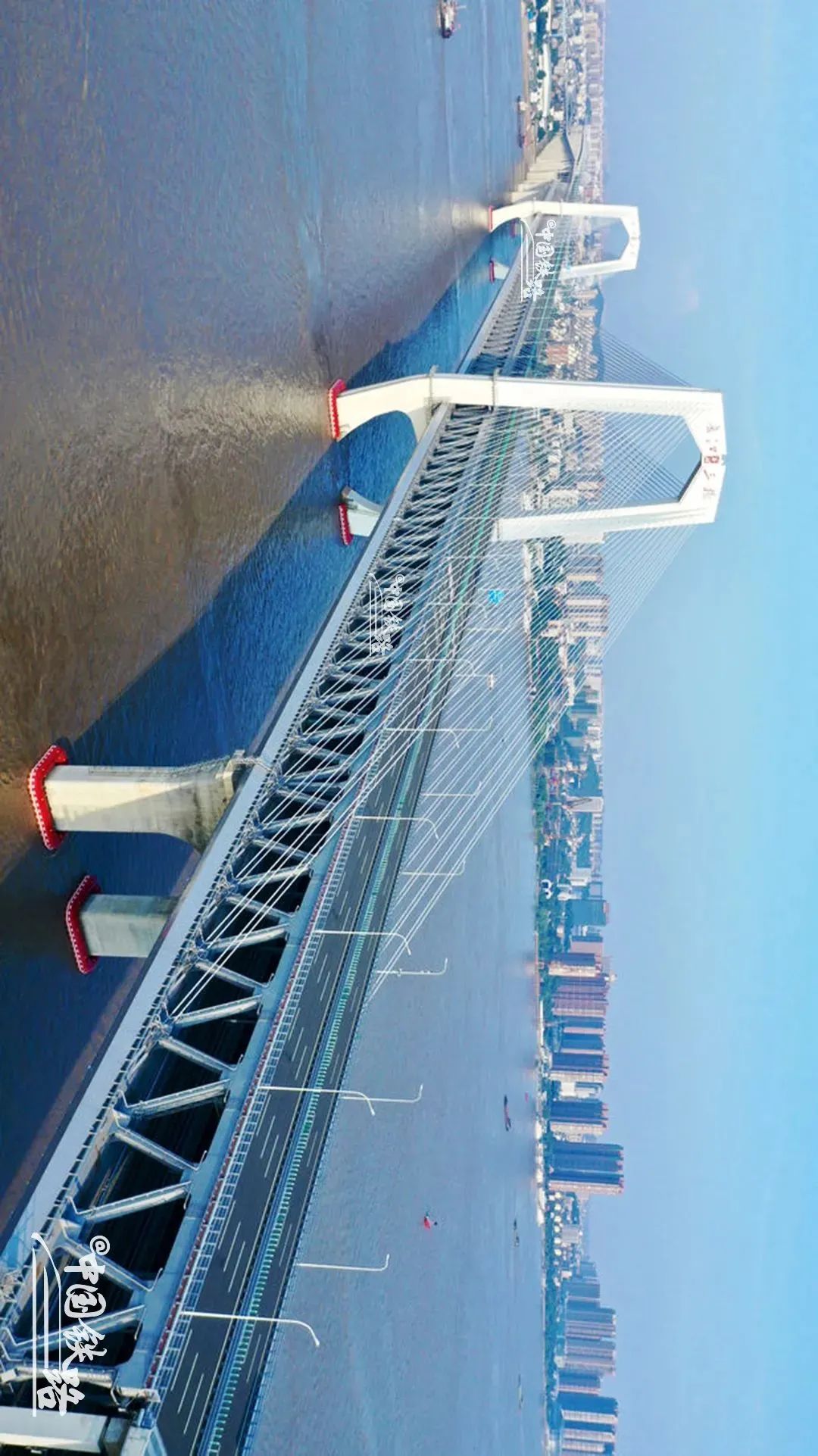 全長9273米,跨水麵正橋長1615米,通航淨空高度為(wei) 32米,可以確保萬(wan) 噸級巨輪通過。