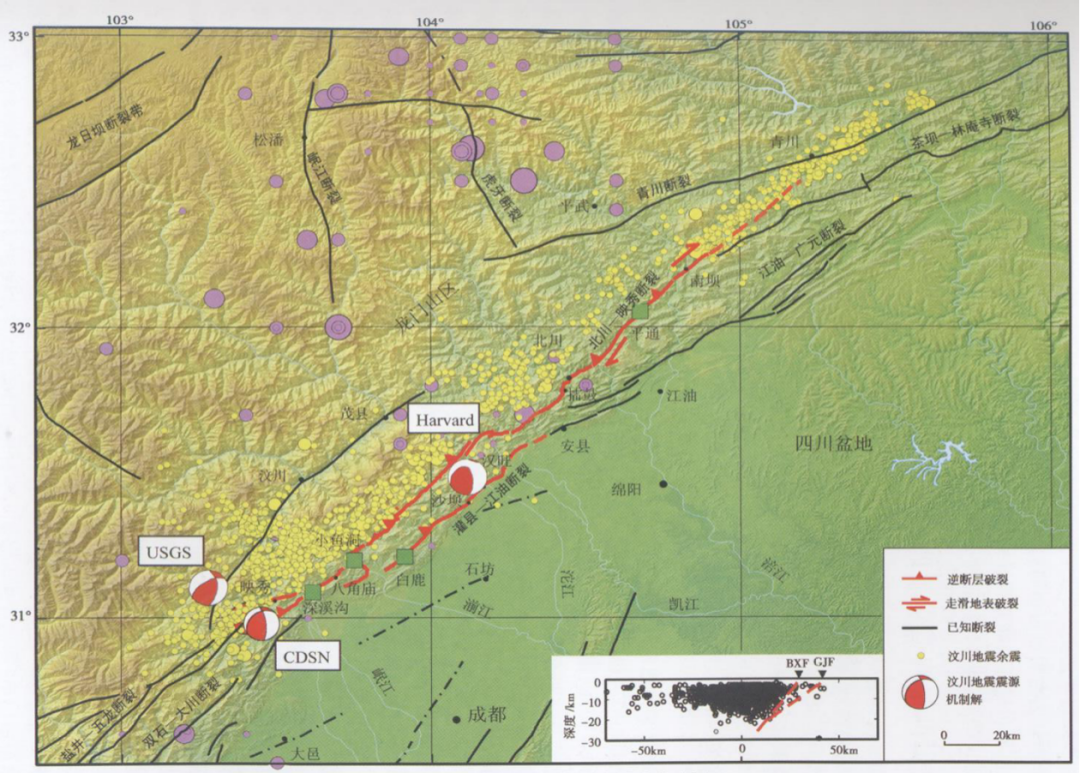 地震發生在四川龍門山逆衝(chong) 推覆構造帶上。該構造帶是青藏高原內(nei) 部巴顏喀喇地塊和中國東(dong) 部華南地塊的邊界構造帶。晚新生代的構造變形主要集中在灌縣-江油斷裂(前山斷裂)、映秀-北川斷裂(中央斷裂)和汶川-茂縣(後山斷裂)及其相關(guan) 褶皺之上,5·12汶川地震發生在映秀-北川斷裂之上,是龍門山逆衝(chong) 推覆體(ti) 向東(dong) 南方向推擠並伴隨順時針剪切共同作用的結果。龍門山向東(dong) 南方向推覆的動力來源是印度板塊與(yu) 歐亞(ya) 大陸碰撞及其向北的推擠,造成了青藏高原的地殼縮短、地貌隆升和向東(dong) 擠出。