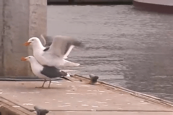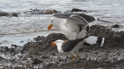 下麵那隻海鷗估計已經有心理陰影了。果然,這個(ge) 過程隻持續了一會(hui) ,它就轉過身,猛地給了對方一下,兩(liang) 鳥這才分開: