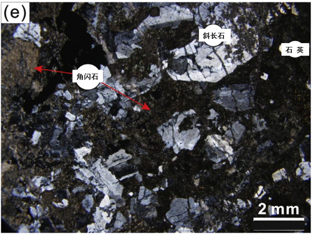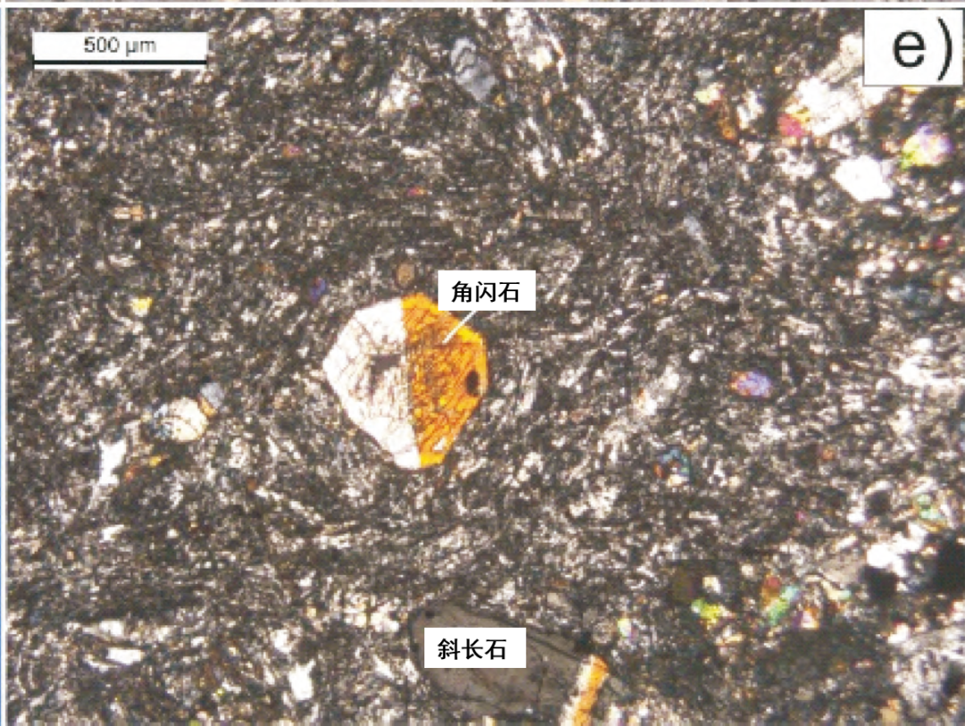 照片中顯示的為(wei) 大的角閃石和斜長石斑晶。