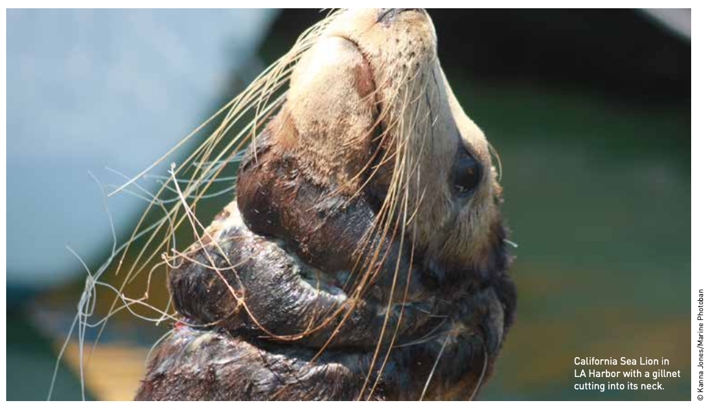 被刺網纏住的加州海獅。