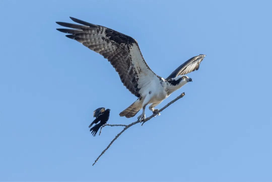 當然,這不是紅翅黑鸝第一次和魚鷹交鋒,由於(yu) 雙方的生活區域重疊在一起,勇敢的黑鸝經常會(hui) 恐嚇威脅魚鷹,這是此前拍到的另一張黑鸝攻擊魚鷹的照片,但魚鷹似乎一如既往地不理不睬。