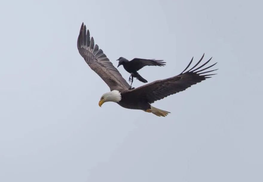不僅(jin) 黑鸝和魚鷹,在其它物種中也時常發生這種以小博大的案例,一位名叫Phoo Chan的攝影師,就曾在加利福尼亞(ya) 拍到過一隻烏(wu) 鴉騎在白頭海雕身上的畫麵。而白頭海雕似乎對此也絲(si) 毫不介意,讓烏(wu) 鴉免費搭乘航班,在背上兜了幾秒鍾的風。