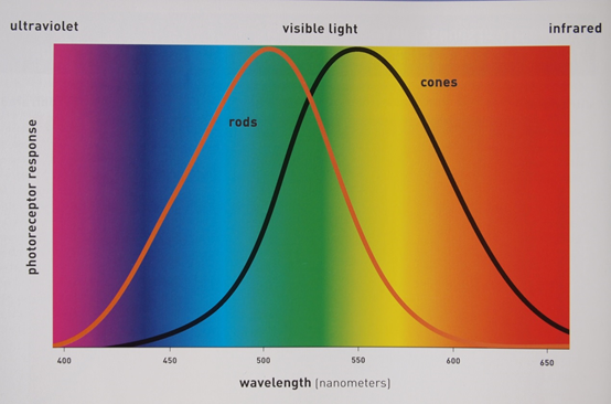 圖2:二種視覺細胞(杆細胞和錐細胞)對不同波長的電磁波的光感受