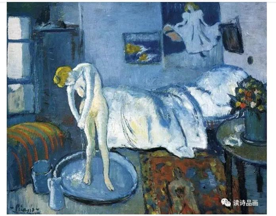 事實上,在觀眾(zhong) 的眼睛裏,不同的外部光線作用下,畫上的顏色會(hui) 發生變化,這種類似的效應還有如燭光效應。20世紀前,許多畫家在創作的時候常常用燭光照明,燭光是一種橙色的光源,後來他們(men) 的作品放在博物館裏展覽的時候都用白光照明。所以觀眾(zhong) 在博物館裏看到的與(yu) 原作比較,在色彩的感覺上有很大的區別。畢加索的某些展覽作品呈現藍色(圖4),被藝術史家稱為(wei) 他創作的“藍色時期”,最近有文獻說,這也許是燭光效應在起作用。