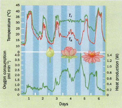 荷花開花的溫度與(yu) 耗氧量,Ta為(wei) 環境溫度,Tr為(wei) 花內(nei) 溫度,豎軸Oxygen Consumptiong為(wei) 耗氧量曲線。