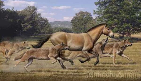 相比於(yu) 大部分的犬科動物,新魯狼的長距離奔跑能力不強,它們(men) 靠伏擊來捕獲獵物,捕獵的對象主要是三趾馬等中小型的食草動物。