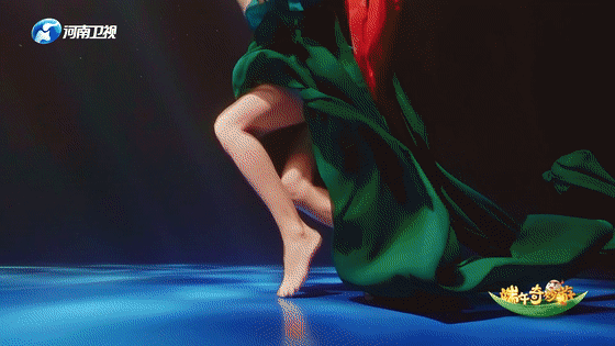 此外,舞者的形象設計參考了唐朝壁畫中飛天的形象——墨綠長裙和裸呈,大紅絡腋和披帛,點綴以杏黃飄帶,正是唐代服飾的標誌性配色。而在水波中,裙帶姿態打破了地麵上重力的束縛,得以自然而舒展地呈現飛天靈動飛揚的姿態。所有設計仿佛渾然一體(ti) ,恰似曹植當年所想象的“翩若驚鴻,矯若遊龍”。