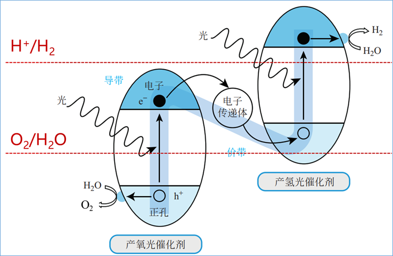 另外,科學家還在探索多級催化的道路,讓兩(liang) 個(ge) 催化劑分別充當產(chan) 氫和產(chan) 氧的角色,這樣就能聯手更多的低能量光子,拓寬對太陽光譜的利用(圖3)。