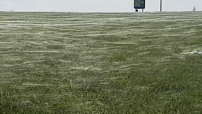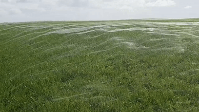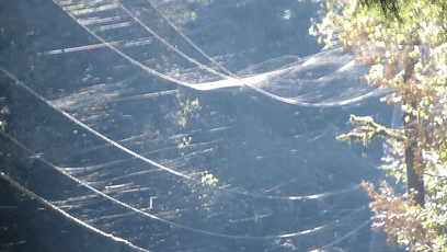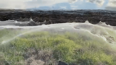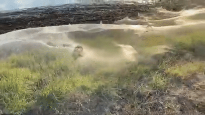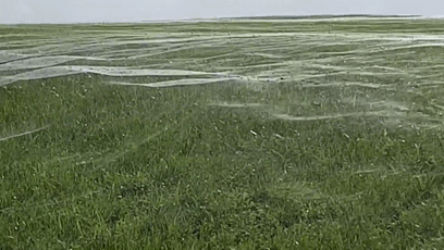 沒錯,在草地上的這層白紗一樣的東(dong) 西,都是蜘蛛絲(si) 。隨著微風吹過,蛛絲(si) 甚至不斷起伏: