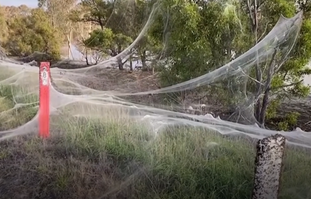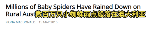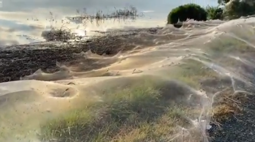在2016年澳大利亞(ya) 的一次洪澇災害中,成千上萬(wan) 隻小蜘蛛爬上了城市郊區的樹,同時它們(men) 鋪設的蜘蛛網覆蓋了將近800米長的區域,附近的植物完全被蛛網所覆蓋。當地居民Ken Puccetti描述說,自己的鞋子、腿、胳膊上都是蜘蛛網,還有一些小蜘蛛。