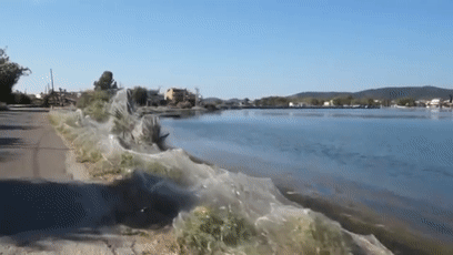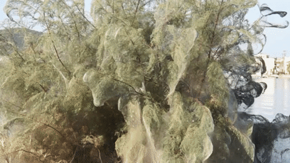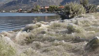 2018年希臘一個(ge) 小鎮就突然被蛛網所覆蓋,附近大部分的植物都被蛛網覆蓋,看起來就像是剛剛下過一場大雪: