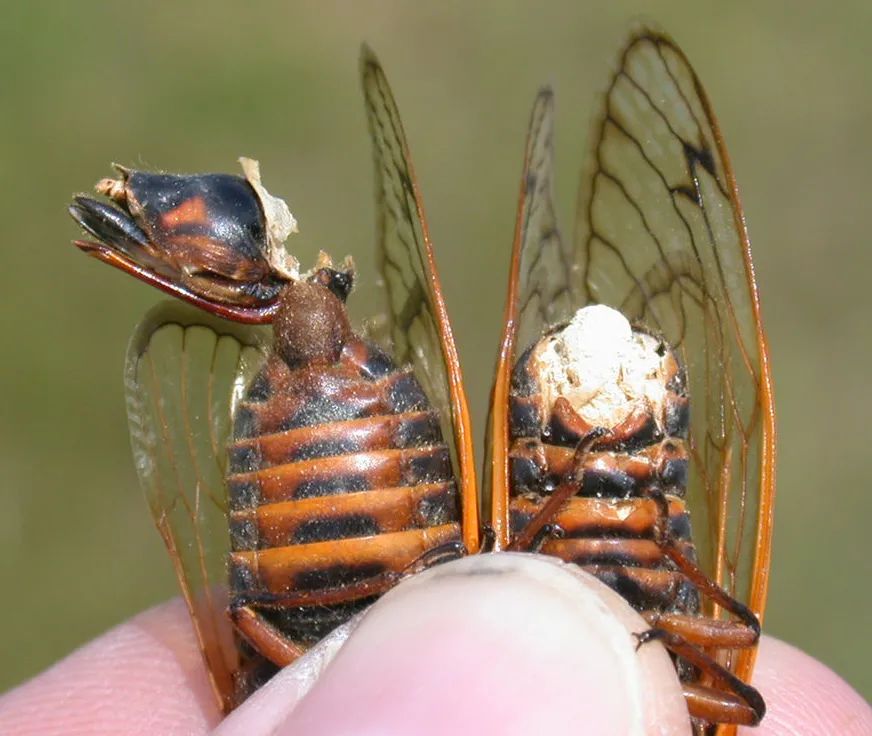 有趣的是,Brood蟬是為(wei) 數不多生活周期與(yu) 捕獵者/病原體(ti) 相同的物種。放到當下的場景裏,即“17年蟬”開始行動時,它的敵人也開始行動了。一種名為(wei) 蟬團孢黴菌(Massospora cicadina)的真菌,簡直就是與(yu) “17年蟬”形影不離。按照長期研究該領域專(zhuan) 家Matt Kasson的說法,這種真菌隻選擇性地感染周期性蟬。Kasson是西弗吉尼亞(ya) 大學的傳(chuan) 染病學家,他一直在叢(cong) 林裏等待這批“17年蟬”破土。