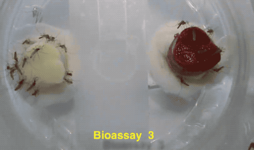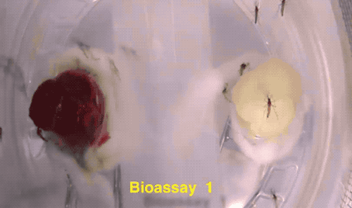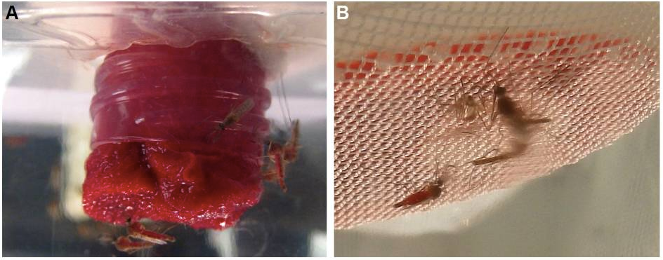 從(cong) 研究者提供的圖片中我們(men) 可以看到,公蚊子們(men) 開開心心地啜飲著血淋淋的棉花球。即使棉花球上還包著一層薄薄的石蠟作為(wei) 阻撓,公蚊子們(men) 也沒有被趕跑。