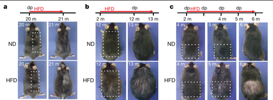 在實驗初期,研究人員對不同年齡的小鼠模型進行高脂膳食(HFD)誘導和普通膳食喂養(yang) ,同時對突變體(ti) 小鼠肥胖模型也進行了相同的實驗。結果發現,高脂膳食會(hui) 導致各個(ge) 年齡段的小鼠毛發減少,如果用脫毛處理刺激小鼠進入毛發再生循環,會(hui) 加重這一現象。因此,研究人員認為(wei) ,肥胖會(hui) 導致小鼠脫發,且該現象與(yu) 性別無關(guan) 。高脂膳食條件下,雄性小鼠會(hui) 在6個(ge) 月出現掉毛現象,雌性小鼠是8個(ge) 月。