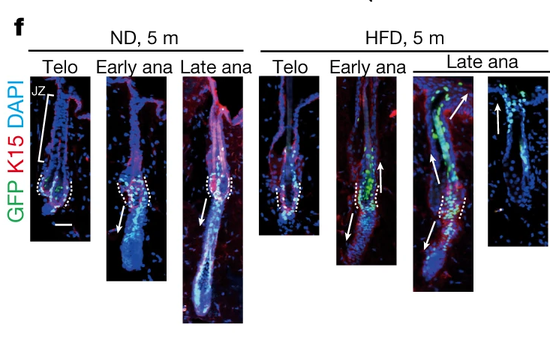 隨著脫發問題越來越受到人們(men) 的重視和關(guan) 心,科學家也開始關(guan) 注毛囊幹細胞,與(yu) 毛囊幹細胞活性相關(guan) 的因素逐漸被發現,日本西村榮美教授團隊首次報道了高脂飲食造成毛囊幹細胞數量減少而導致脫發的機理。