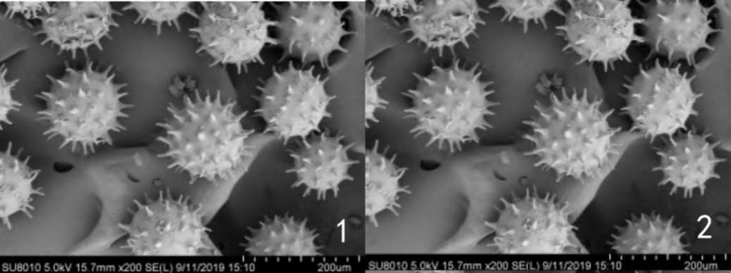 在肉眼可見的範圍之外,很多靠昆蟲傳(chuan) 粉的植物花粉上也分布有毛刺,同樣也是有利於(yu) 附著在昆蟲的身體(ti) 或者體(ti) 毛上,提高傳(chuan) 粉效率。例如木槿的花粉粒就帶有密密麻麻的刺。