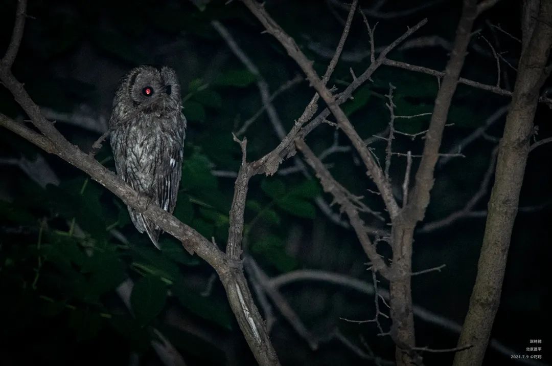 一天晚上,我們(men) 在十三陵林場夜巡,遇到一條玉斑錦蛇後,又見到一隻灰林鴞,它在樹枝上行走,憨態可掬。