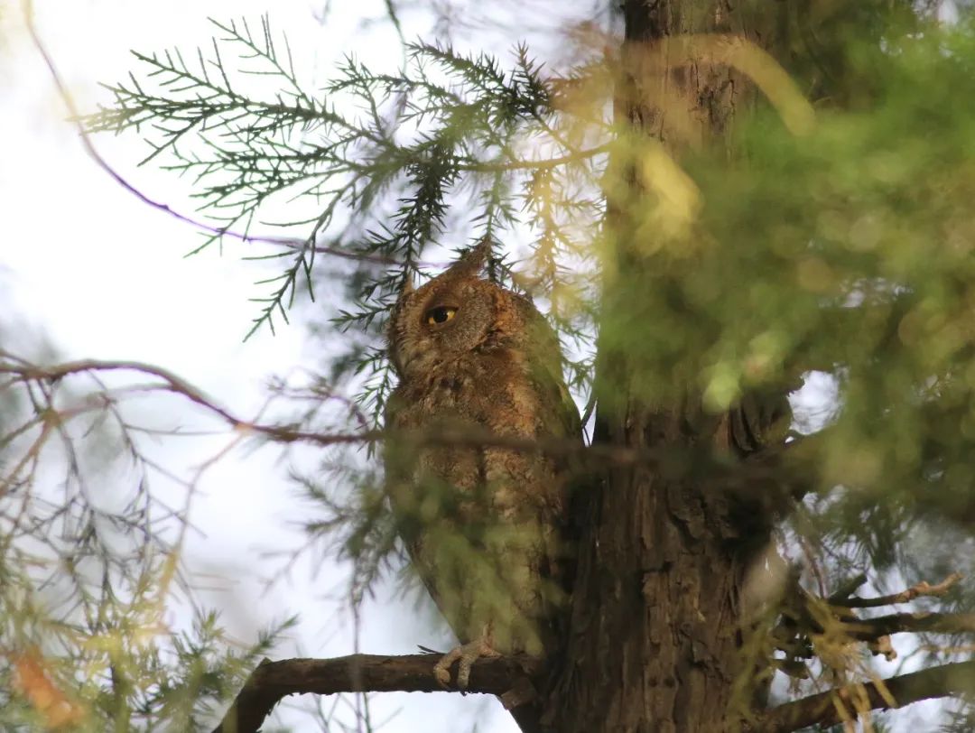 如果你幸運地發現了紅角鴞的棲身處,很有可能每天路過的時候都能看到它們(men) 的黑影。