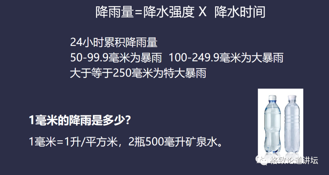 降雨的強度一般怎麽(me) 衡量呢?大家經常會(hui) 聽到天氣預報通報下小雨、中雨、暴雨等等。我們(men) 可以在觀測場拿集水瓶集雨水,經過24小時的累積後,如果累積降雨量達到了50到99.9毫米,一般就叫暴雨。如果累積降雨量超過了100毫米,不到250毫米,就叫大暴雨。累積降雨量大於(yu) 等於(yu) 250毫米的就叫特大暴雨。1毫米是每一平方米收集到1升水,所以1毫米其實也不少,而50毫米的雨就是相當大的量。