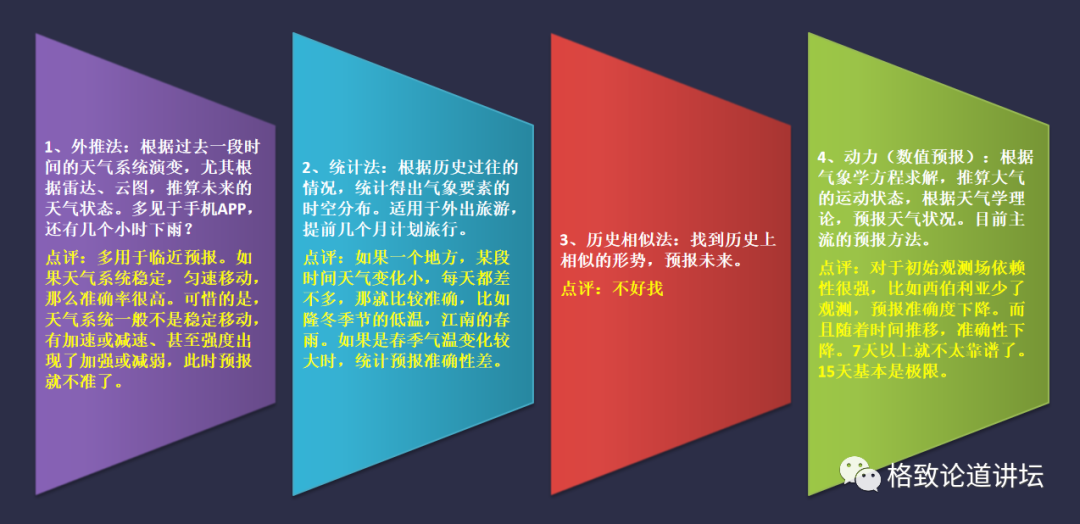 這個(ge) 過程就是下圖中的第四類方法,叫做動力(數值預報)的方式。這需要大量的計算,人很難計算出來,所以需要超級計算機來進行計算。如果初始的觀測場的數據不全,或者資料不準確,就會(hui) 降低天氣預報的準確性。