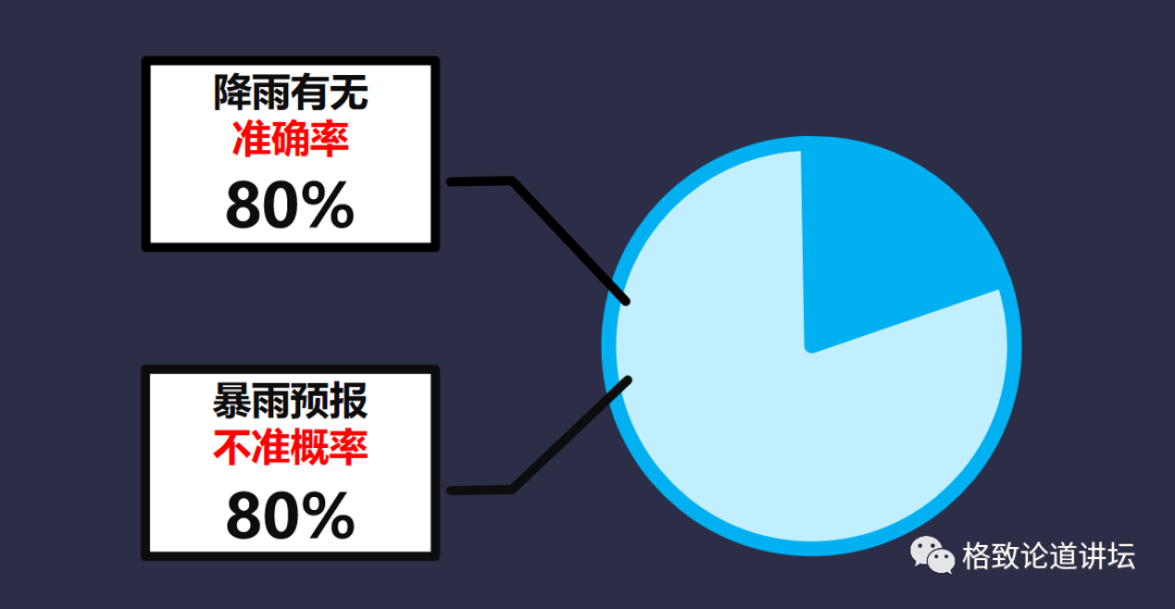 接下來我講一下為(wei) 什麽(me) 天氣預報會(hui) 不準。以現代的科技水平來說,我們(men) 確實報不準,這是事實。首先,給大家展示均為(wei) 80%的兩(liang) 個(ge) 數據。降水有無的準確率達到80%。強降水,即暴雨的不準確率是80%。