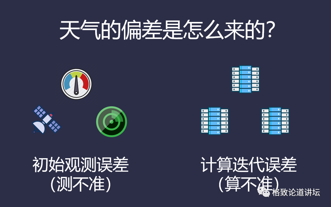 其次是算不準。在計算過程中有一大堆方程組,其實那個(ge) 方程組本身是無解的,我們(men) 為(wei) 了求出一個(ge) 近似解,在取近似值的過程中就會(hui) 產(chan) 生誤差,越累積到後麵誤差就越大,這呈現在天氣預報裏就很“要命”。