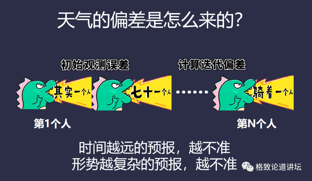 其實,天氣預報的誤差就像傳(chuan) 話。比如,班主任今天和第一排的同學說了一句話,可能這個(ge) 老師有口音,發音不太標準,他想說其實一個(ge) 人,就變成了71個(ge) 人,這就是初始觀測誤差。傳(chuan) 到最後這句話就變成了騎著一個(ge) 人,意思完全不一樣了。