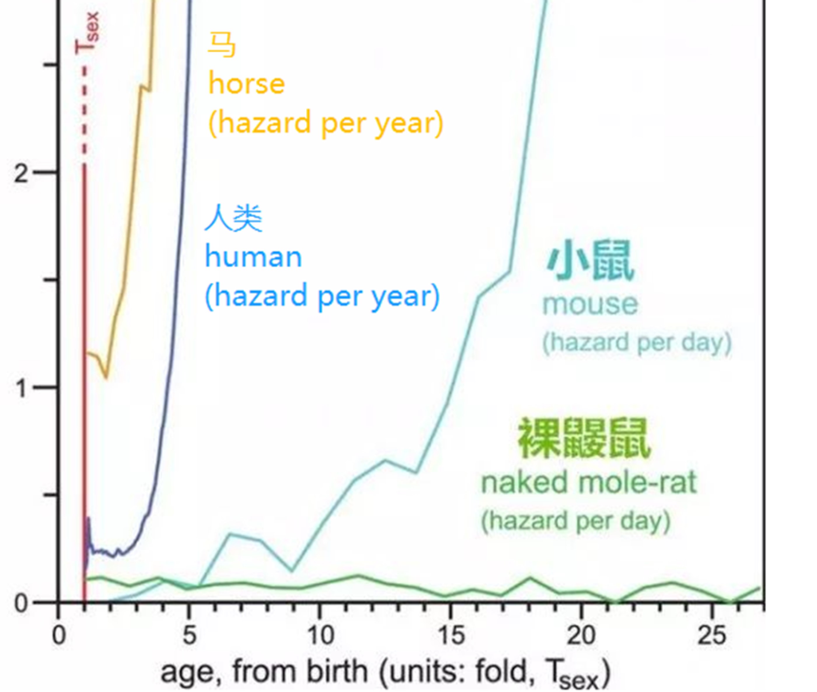 人類出生時,死亡風險為(wei) 0.01%,裸鼴鼠是0.01%。人類5歲0.5%,裸鼴鼠還是0.01%,當人類死亡風險拔高到超出表格時,裸鼴鼠還是0.01,甚至還有些下降……