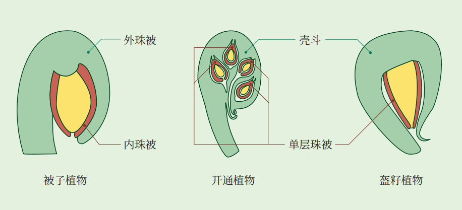 被子植物具有內(nei) 、外兩(liang) 層珠被結構,相比之下,同為(wei) 裸子植物的開通植物與(yu) 盔籽植物雖然隻有單層珠被,但外側(ce) 被一個(ge) 形態與(yu) 外珠被相近的彎曲的殼鬥包裹。史恭樂(le) 等人的研究證實了這些殼鬥與(yu) 被子植物的外珠被具有同源性,因此開通和盔籽均為(wei) 被子植物的祖先類群。